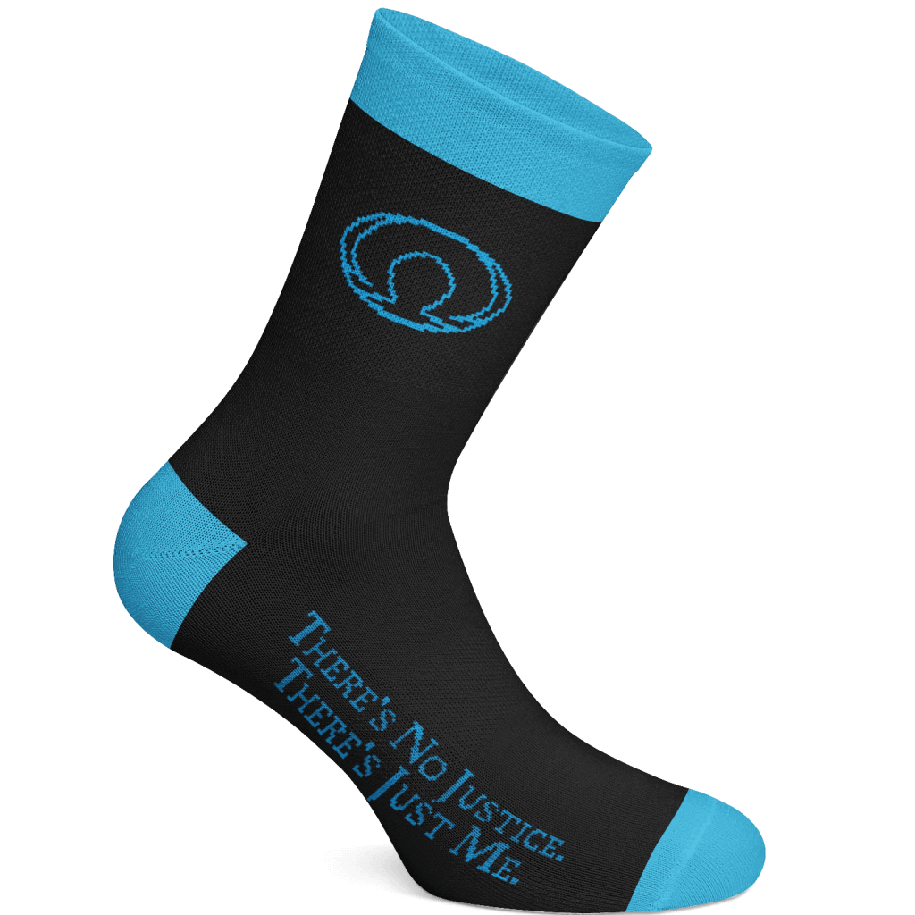 • One pair of black socks with Death’s omega symbol and one of His most well-known sayings in electric blue.
