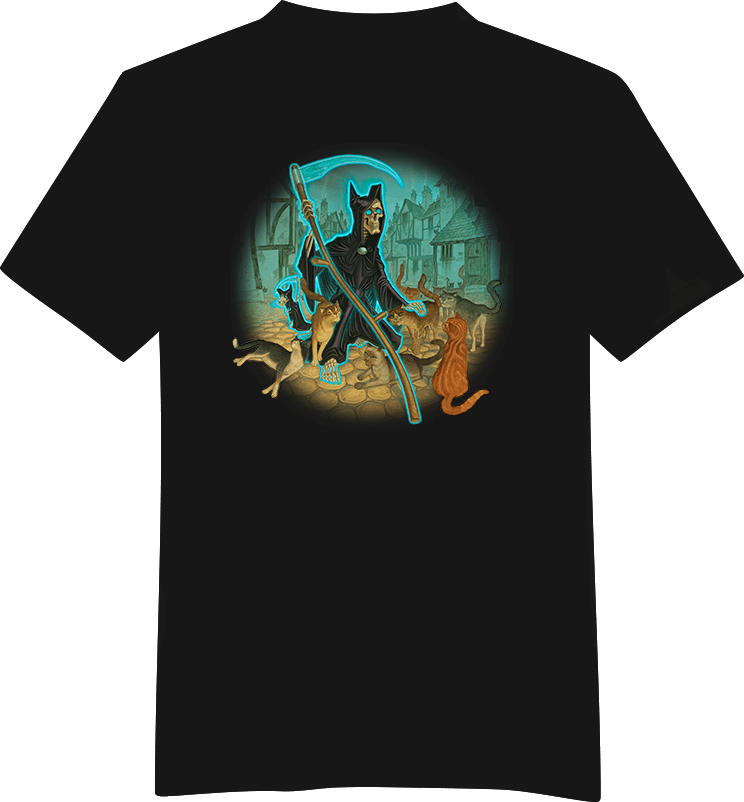 This high quality black Gildan t-shirt is screen printed, with a design by Discworld artist Paul Kidby, showing Death with his favourite animals.