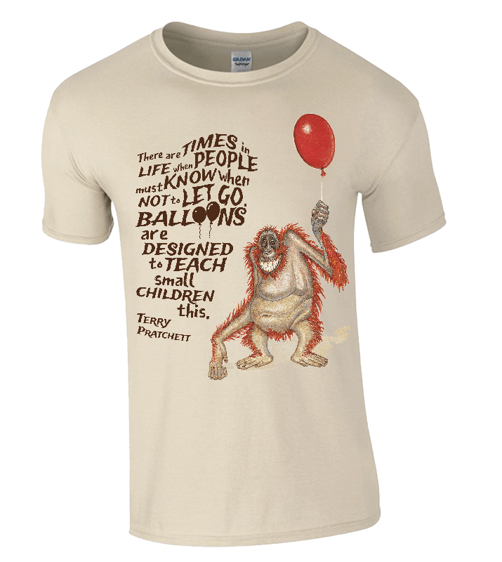 This high quality sand coloured T-shirt is printed using a DTG process. It portrays the blissfully happy Librarian holding onto a red balloon.