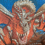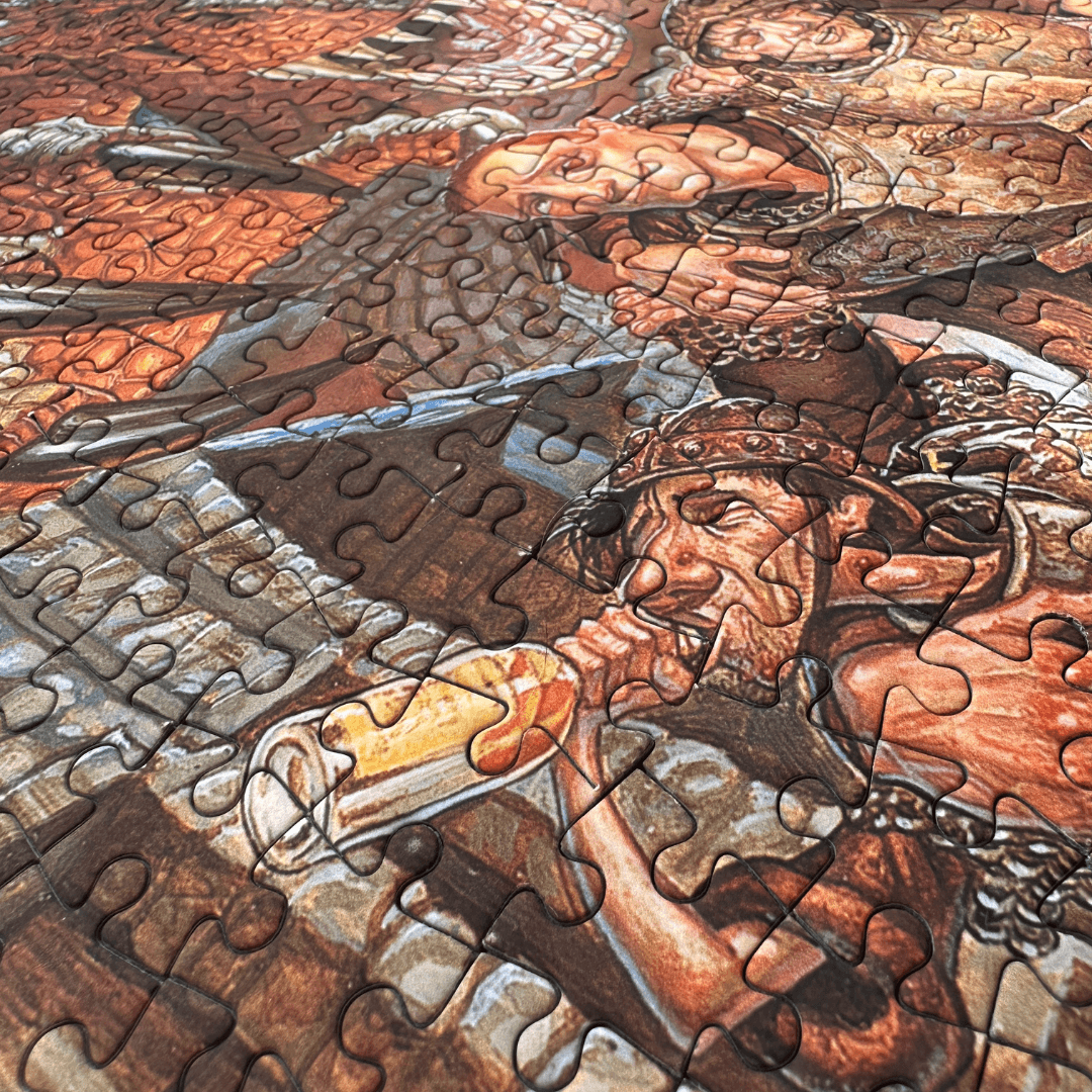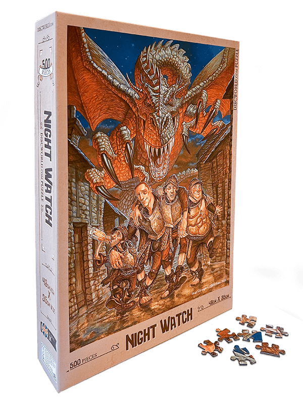 500 PIECE PUZZLE – Here you see the Night Watch ‘proceeding’ away from the dragon. It is the task of the Night Watch – Captain Vimes, Sergeant Colon, Corporal Nobbs, and new volunteer Carrot Ironfoundersson – to stop the Dragons reign of terror, with some help from the Librarian, but it seems here that our fearless heroes are taking a break from their duties! Can we really believe they live by their bold motto “FABRICATI DIEM, PVNC”, (“Make my day, punk”).