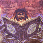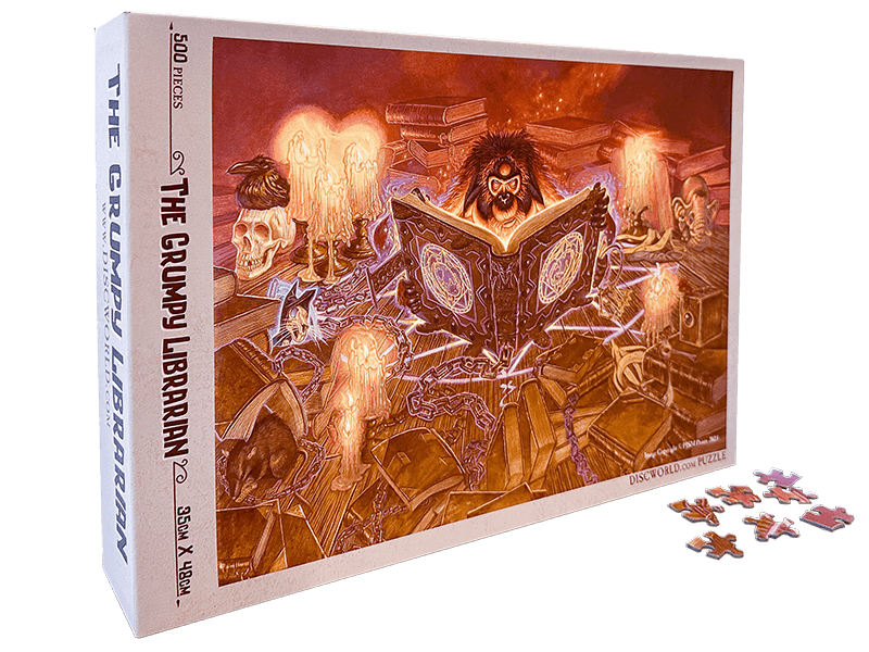 500 PIECE PUZZLE – The Librarian delighted readers in The Colour of Magic, and was transformed into an orangutan in The Light Fantastic as the Octavo fired a beam of magic upwards. On discovering that being an orangutan had certain advantages for a librarian – he can climb up to high shelves, for example – he refused to be transformed back into a human and has remained an orangutan ever since.
