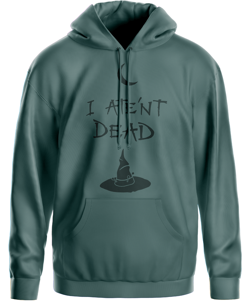 High-quality moss green Granny Weatherwax hoodie, bearing the legend of her famous sign – ‘I Ate’nt Dead‘.