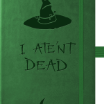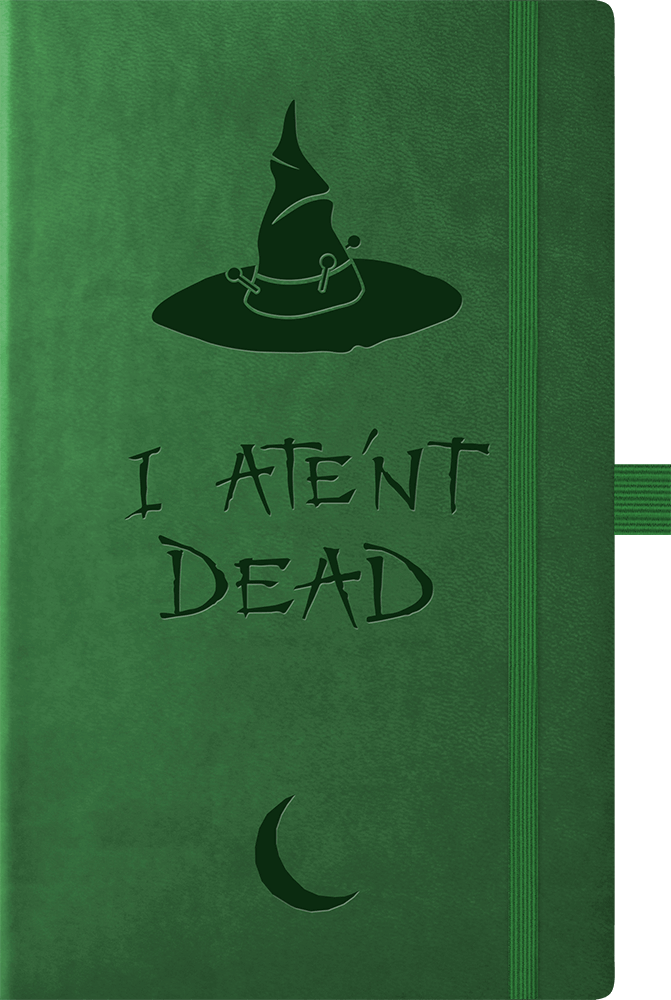 A beautiful A5 faux-leather notebook, with lined pages, embossed with the hat of Granny Weatherwax, and bearing the legend of her famous sign – ‘I Ate’nt Dead‘.