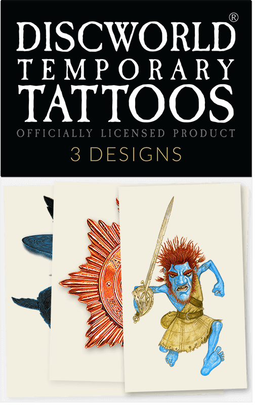 Buy all three Discworld temporary tattoos in one pack! Included are Rob Anybody, The City Watch crest and Great A’Tuin.